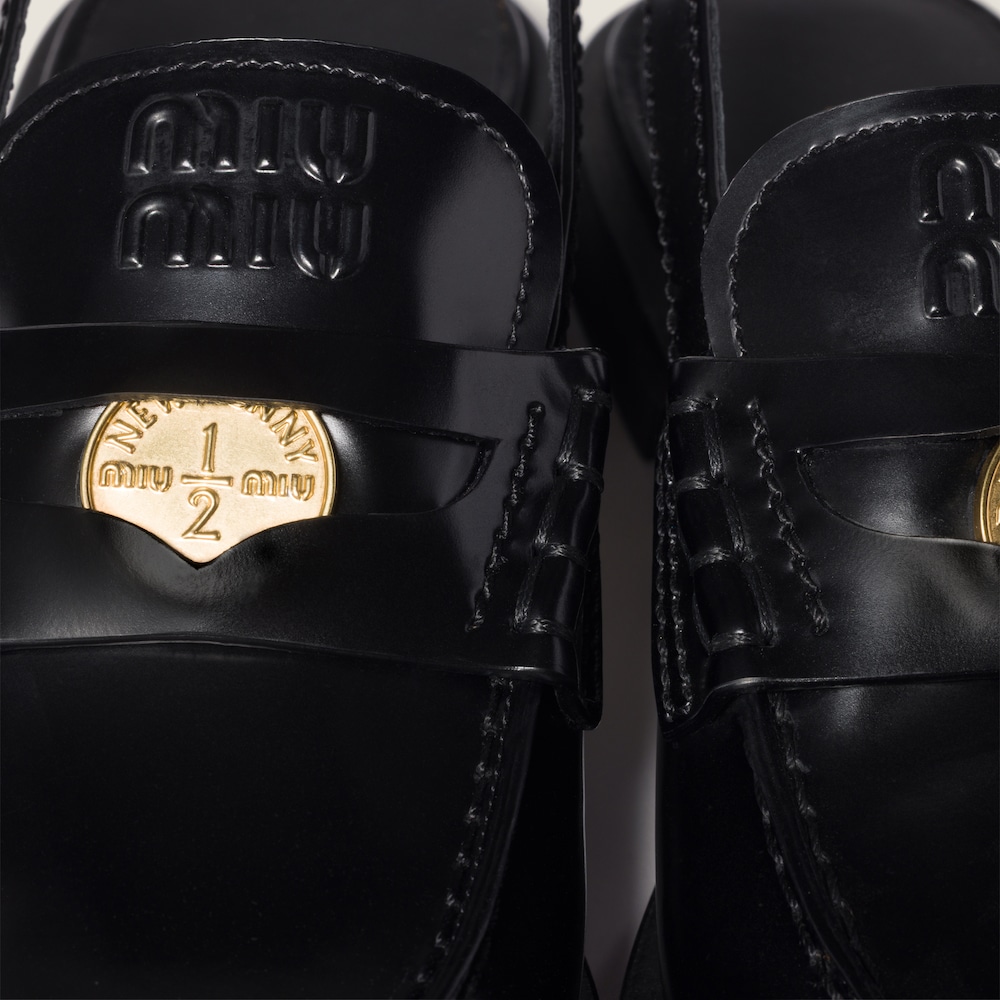 The versatile Miu Miu loafer, ideal for everyday use, is reinterpreted in this slingback variation decorated with the gold-tone details of the buckle and "penny", embodying an experimental, preppy attitude.