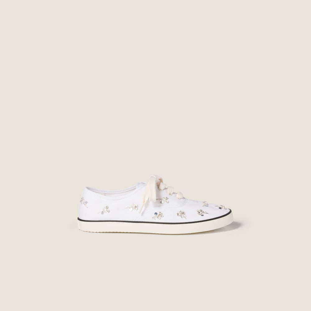 A sparkling floral embellishment made of crystals enriches these drill sneakers, combining a sporty essence and experimental contrasts with a contemporary design typical of the Miu Miu wardrobe.