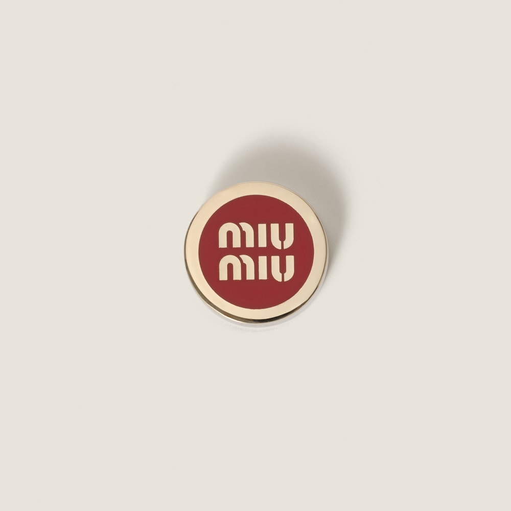 Miu Miu's iconic logo is the protagonist of this two-tone enameled metal brooch, to be worn with sneakers and accessories to create new combinations and playful styling.