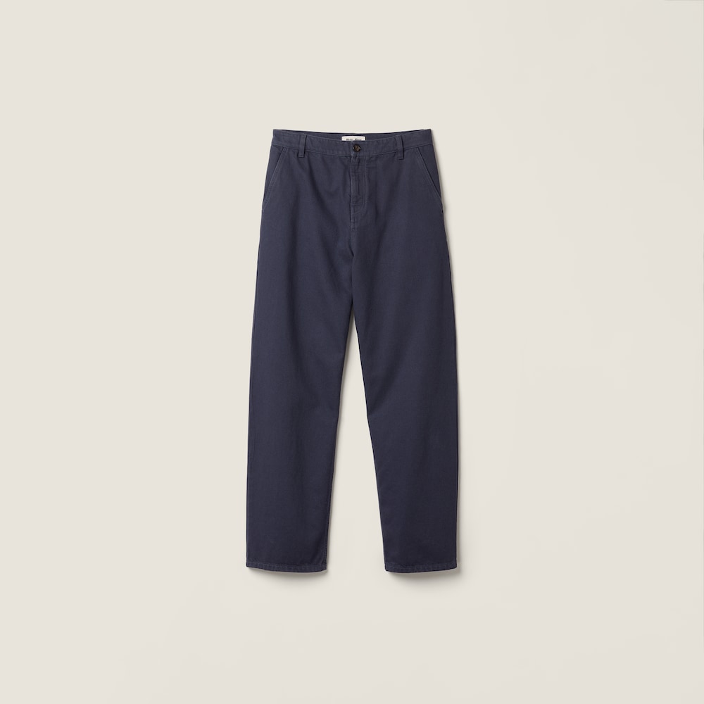 Inspired by workwear, these gabardine pants have a relaxed fit and menswear cut. The resistant diagonal weave, enhanced by garment dyeing, gives the pants an authentic, vintage look.