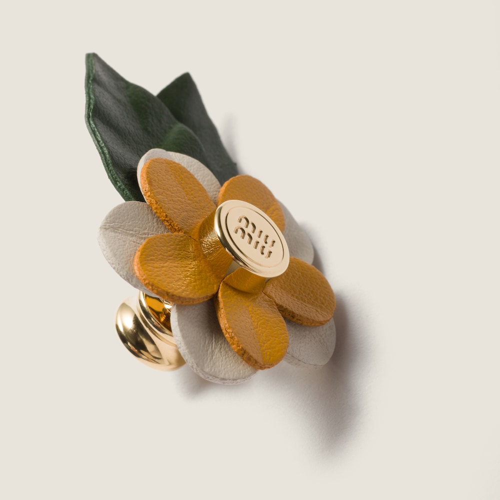 Miu Miu's bold, playful character comes to life in this floral-inspired brooch with metal logo that enriches the silhouette of sneakers and bags, creating unique style combinations.