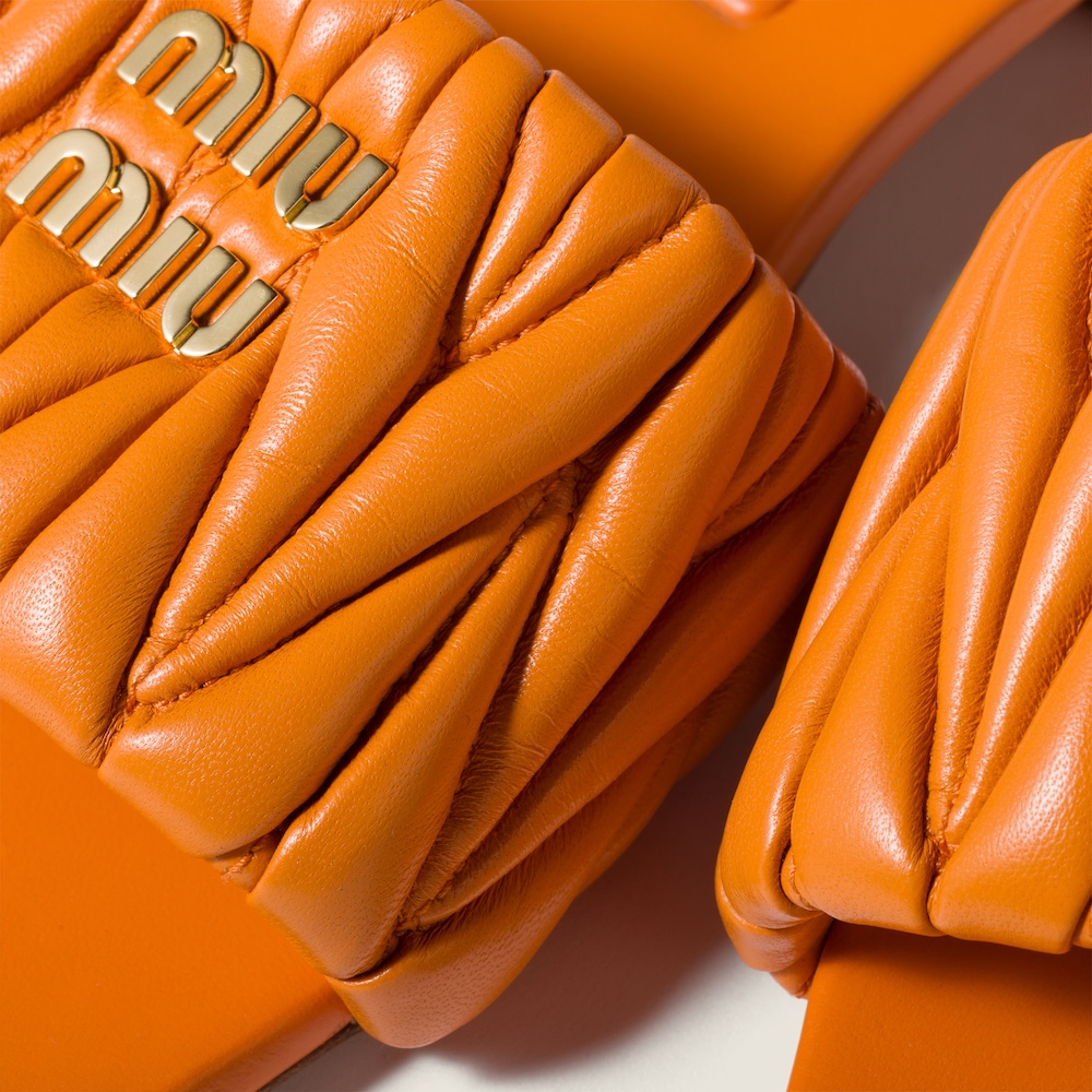 Fine matelassé workmanship gives these nappa leather slides a refined, textured, three-dimensional appearance. The metal lettering logo stands out on the matelassé motif thanks to its contrast in color and texture, giving the sandal an iconic note.