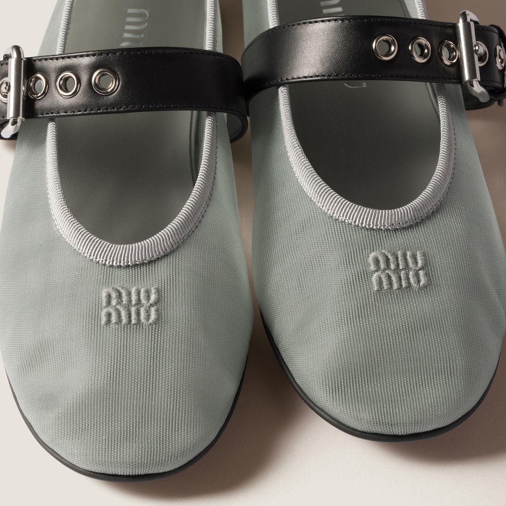 The iconic allure of the Miu Miu ballerina flat finds new expression in this summery mesh fabric version featuring an elegant texture and bold strap closure.