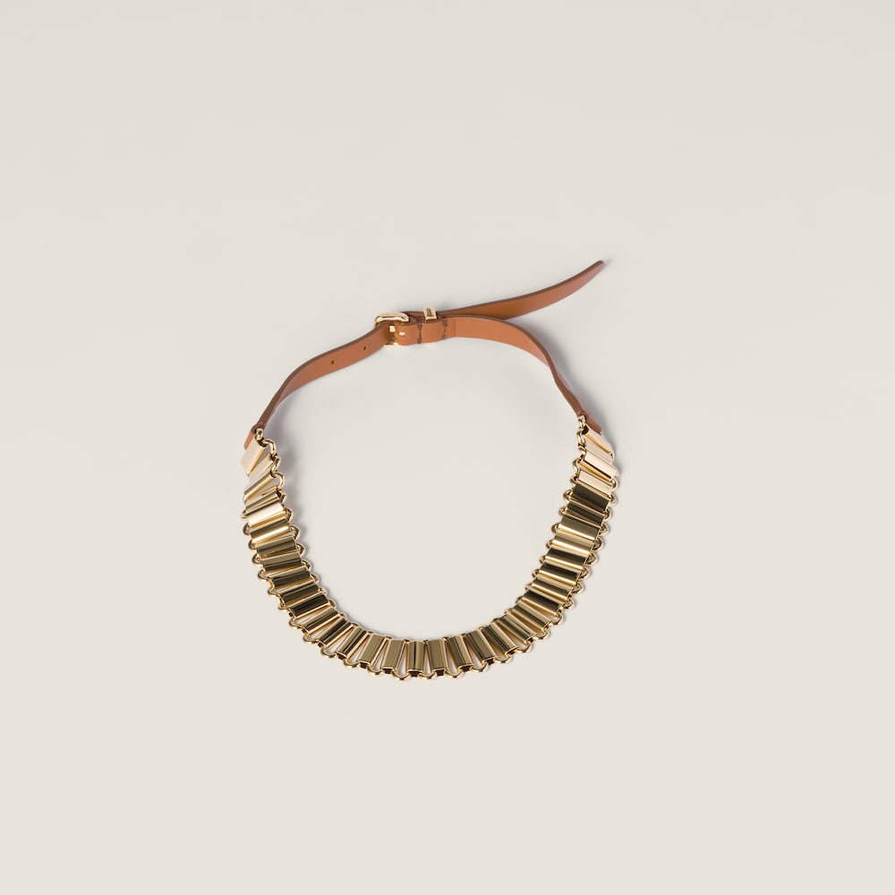 Inspired by the belts of the SS25 fashion show, this necklace combines the lustrous shine of its gold elements with the sophistication of soft leather, elevating simple looks through bold layering and contrasts, an emblem of Miu Miu's versatile femininity.