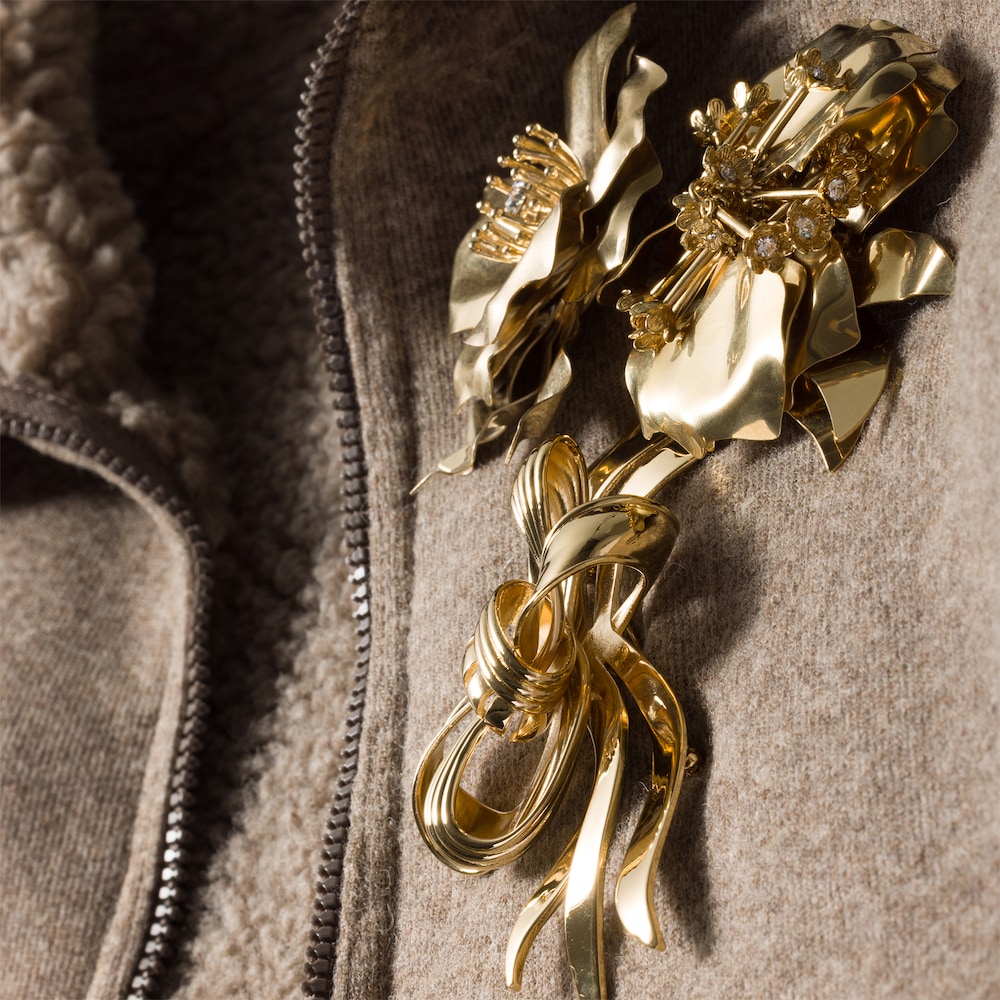 The intertwined bow design of this oversized brooch blends classic inspirations and a contemporary spirit, with sculptural volumes and lustrous reflections that add movement and character to simple looks.