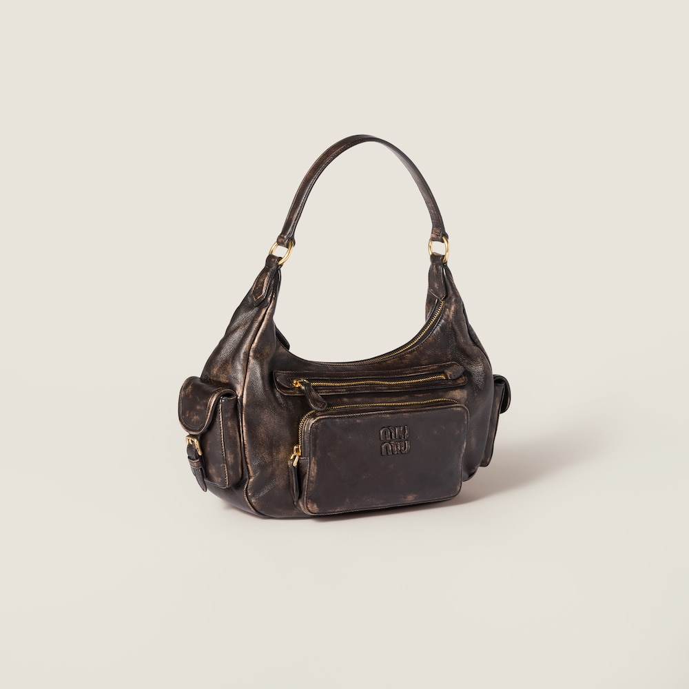 The unmistakable multi-pocket design of the Pocket bag embodies the refined functionality of Miu Miu style. This soft aged nappa version stands out for its new volumes and unique details.