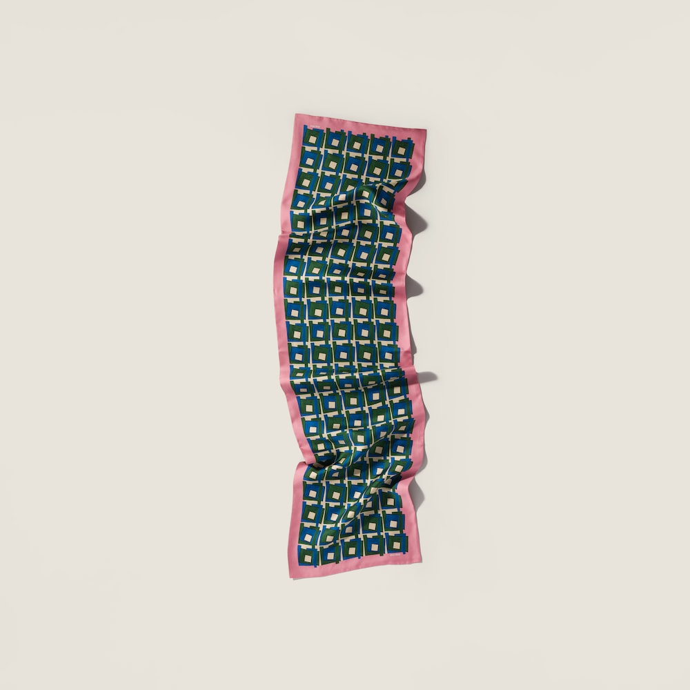 Colorful geometric patterns recalling vintage inspirations enhance this silk twill scarf that completes seasonal looks with versatile, layered combinations.