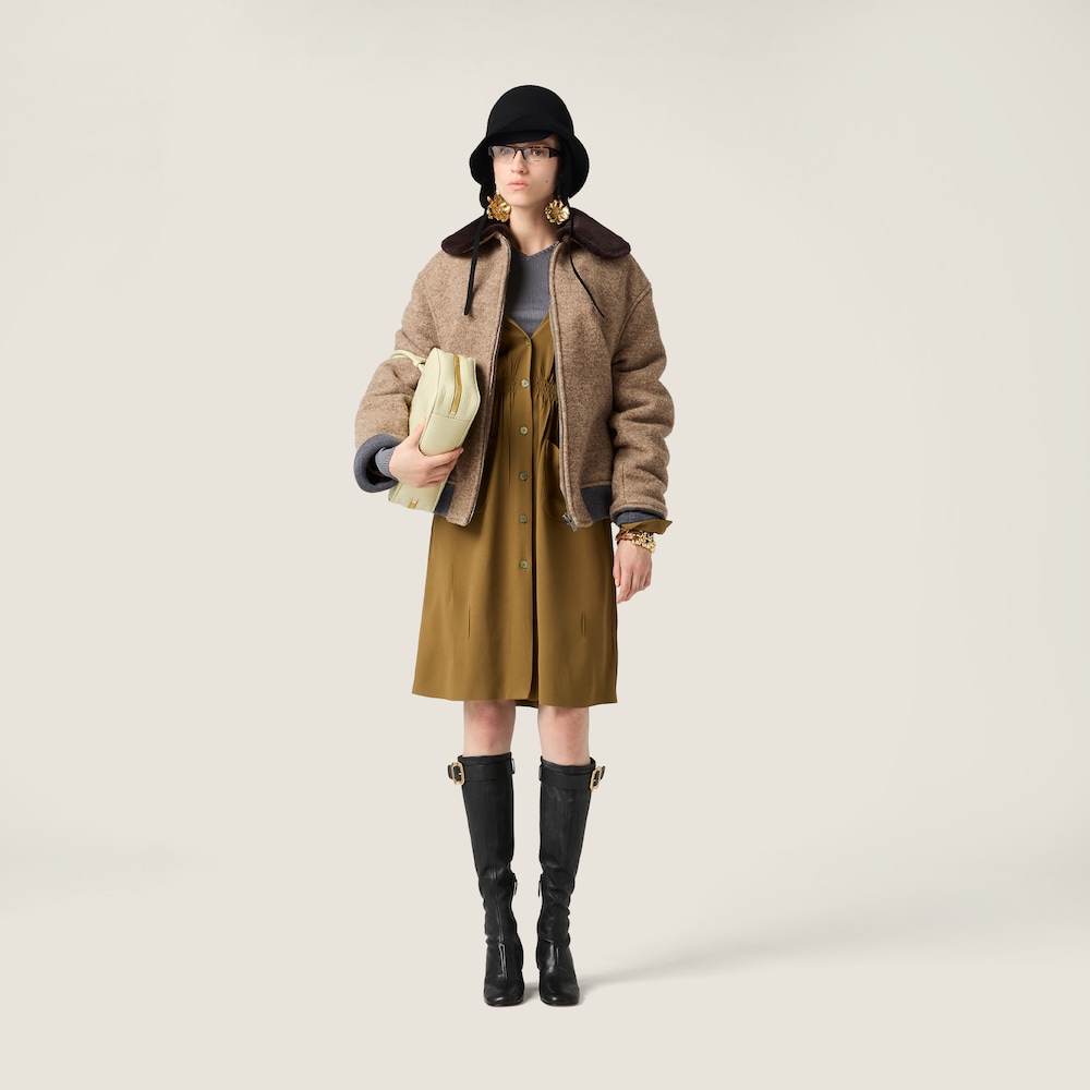 The classic silhouette of the Miu Miu blouson jacket is dressed in the unique lightness of Shetland wool enriched with the embroidered logo and fur collar to create an iconic look of contemporary femininity.