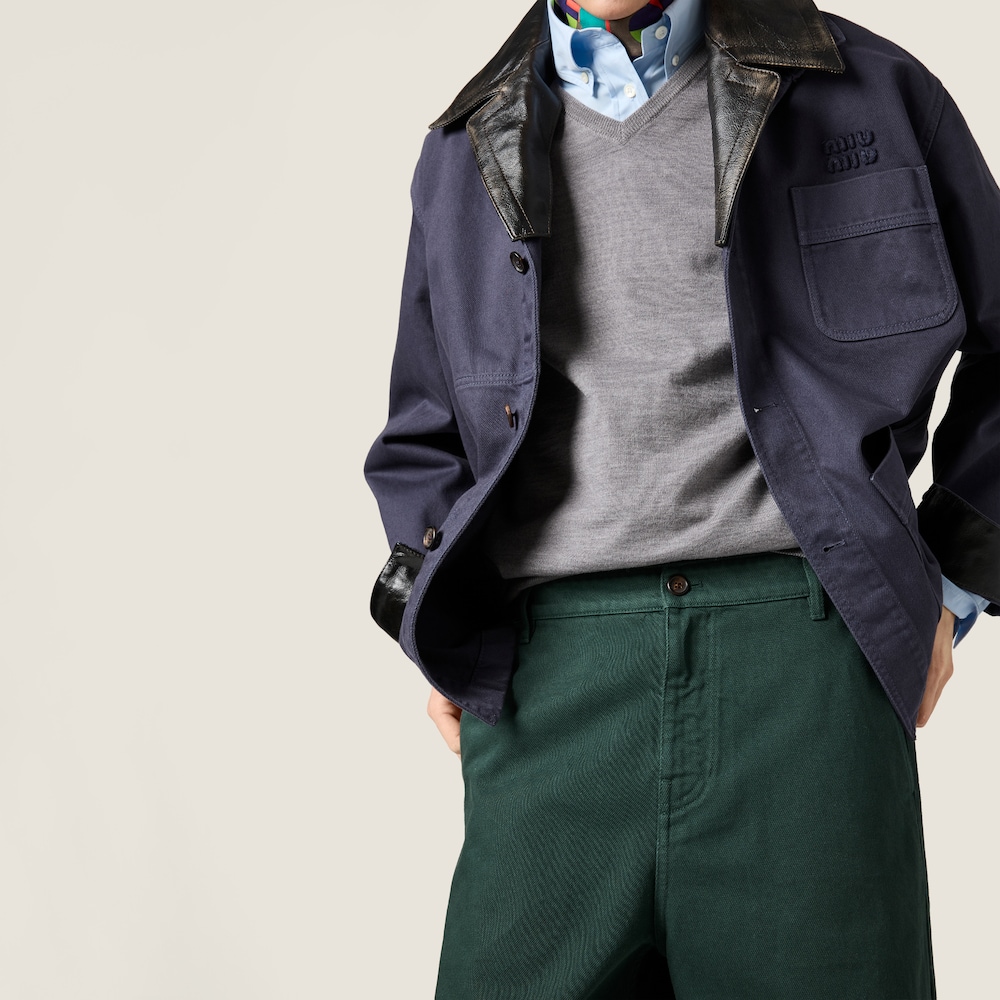 This jacket inspired by men's workwear expresses an authentic, vintage look thanks to durable, garment-dyed cotton gabardine with intense color. Leather details in a contrasting color add an unexpected, artisanal character.