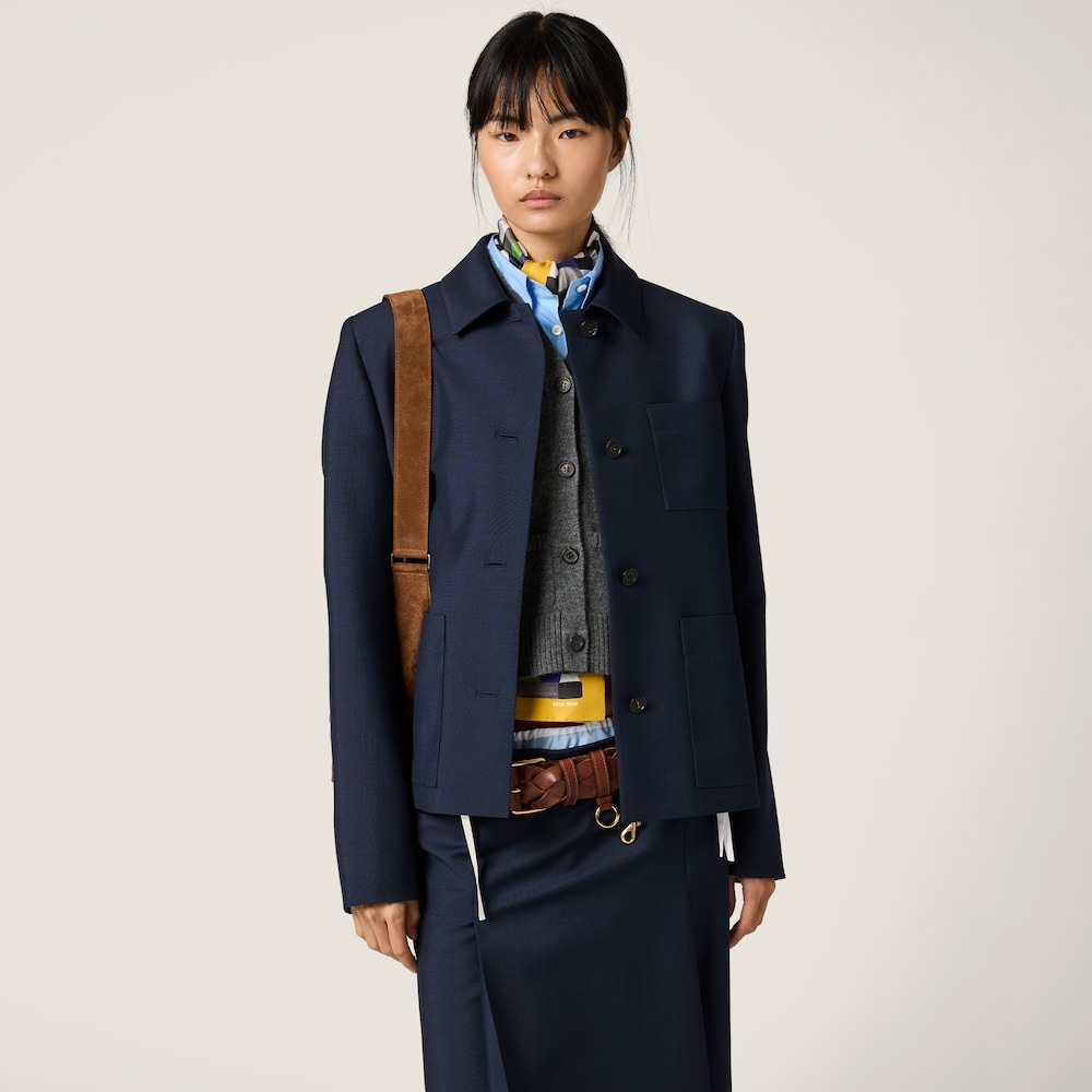 Structured lines and a 1970s aesthetic characterize this jacket made of kid mohair, an iconic Miu Miu material that combines exceptional softness and a subtle sheen, recalling the codes of tailored menswear.