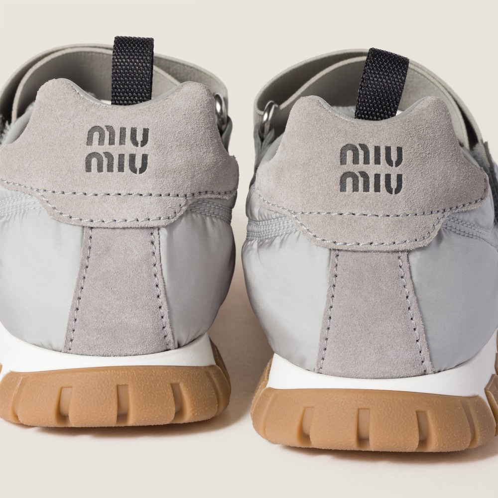 Tyre combines elegance and sporty functionality. The dynamic rubber sole, which is flexible and scuff-proof, recalls the pattern on tires. Made of technical fabric and suede, this version of the ballerina expresses Miu Miu's bold identity.