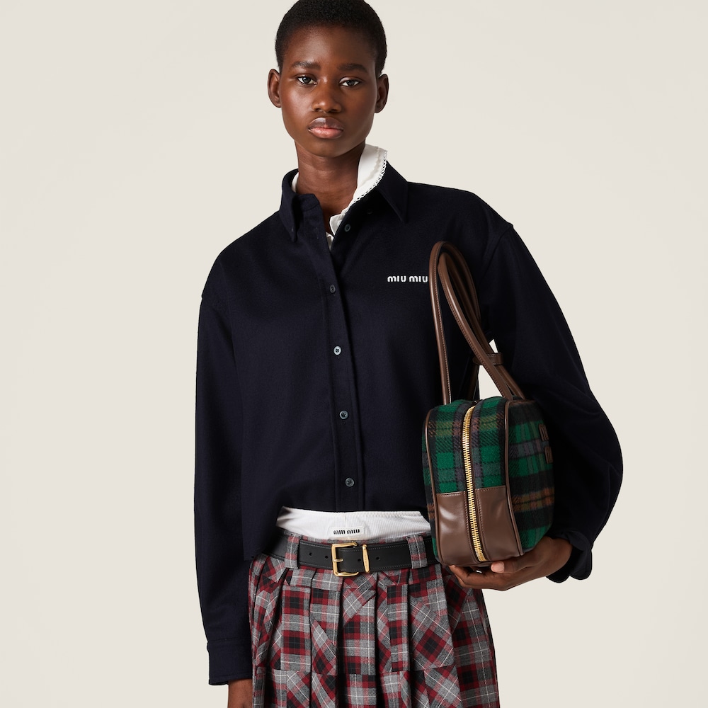 The iconic Miu Miu shirt is reinterpreted with a slightly cropped fit in this velour wool version that combines menswear codes with a young, contemporary essence.