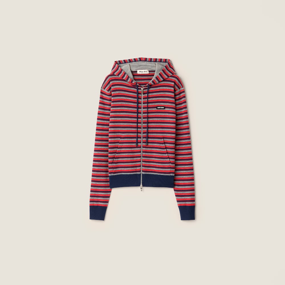 A play of color enhances Miu Miu's lively stripe motif, the protagonist of this iconic knit wool hoodie, an expression of the sophistication of a simple garment with a contemporary fit.