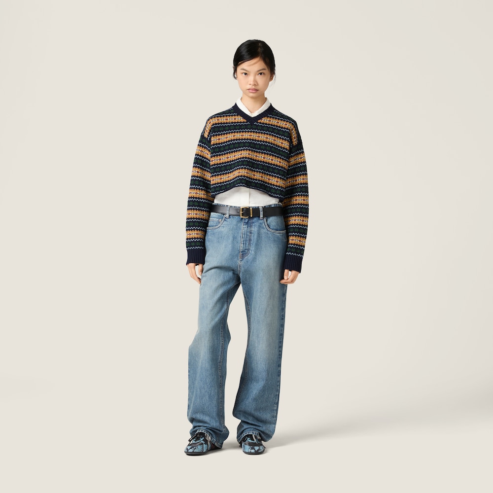 The classic Scottish motif of this wool sweater enhances its lines and texture, while the seamless construction and cropped cut blend the charm of traditional knitwear with contemporary technology and style.